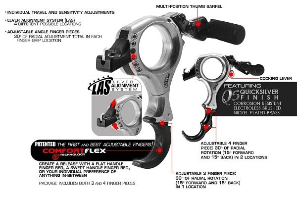 The Abyss Flex is a brass thumb activated release, that use the same exact handle as the Fulkrum and Fulkrum Flex, with the same impact points. The Abyss Flex also uses the same Lever Alignment System (LAS) Technology as the Fulkrum and Fulkrum Flex. What does this mean? It means that you don't have to worry about what hinge/back-tension release to choose, you now have one to match in the Fulkrum or Fulkrum Flex. The Abyss Flex has a single sensitivity adjustment screw with a lock that can be adjusted infinitely for your personal feel. Re-tighten the lock after your adjustments are made. New in the Abyss Flex is the comfort flex technology that now allows the archer to select infinite finger locations on both the three finger and four finger handle pieces. Each piece can be individually moved a total of 30 degrees. The Abyss Flex feature a simple locking travel adjustment screw, that allow you to set the travel to your preference quickly and easily. An adjustable thumb trigger comes standard on the Abyss Flex allowing a "where you want to feel." All Abyss Flex models contain the pieces to make your release a three finger or a four finger release. Crisp, clean and comfortable shots are what you can expect with the Abyss Flex